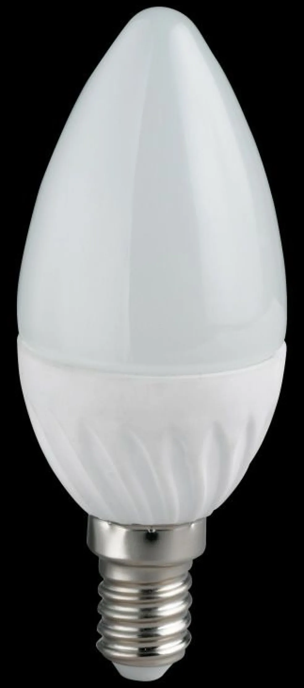 Ampoule à économie d’énergie LED E14 – 4 watts – 3000 K – 310 lm. Puissance comparée aux ampoules habituelles : env. 30 watts.