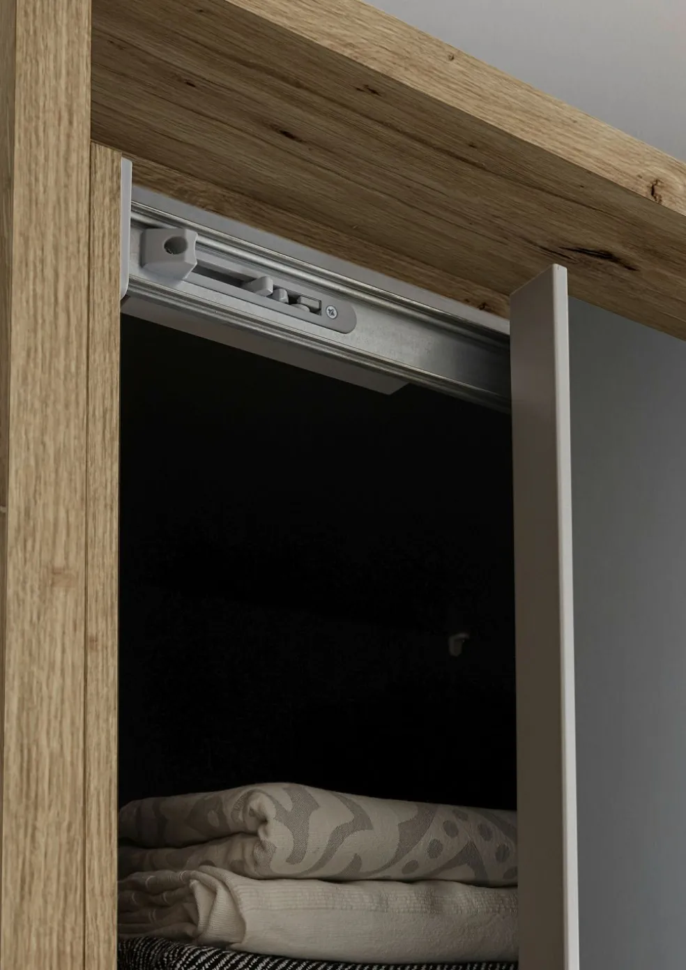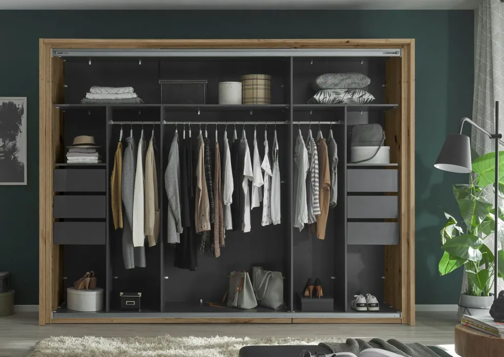 Répartition intérieure : 1 paroi médiane ; côté gauche : 1 grande tablette de part en part, 2 parois de séparation, 2 barres de penderie et 1 bloc tiroirs intérieur mit 3 tiroirs ; côté droit : une tablette de part en part, 1 paroi de séparation, 1 barre de penderie et 1 bloc tiroirs intérieur avec 3 tiroirs