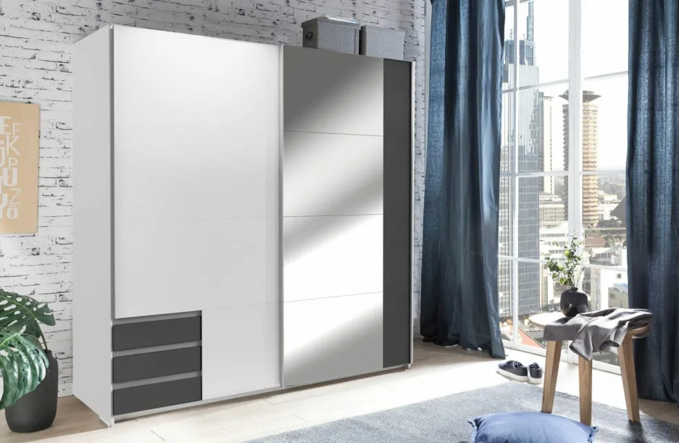 Ton blanc et contrastes (porte de droite et tiroirs) ton graphite / miroir