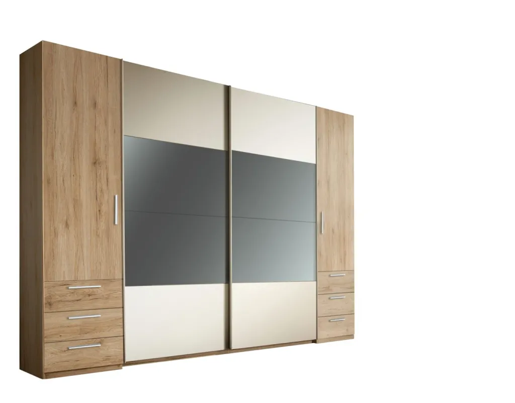 Façade : imitation bois chêne San Remo clair combinée à des contrastes en blanc / miroir