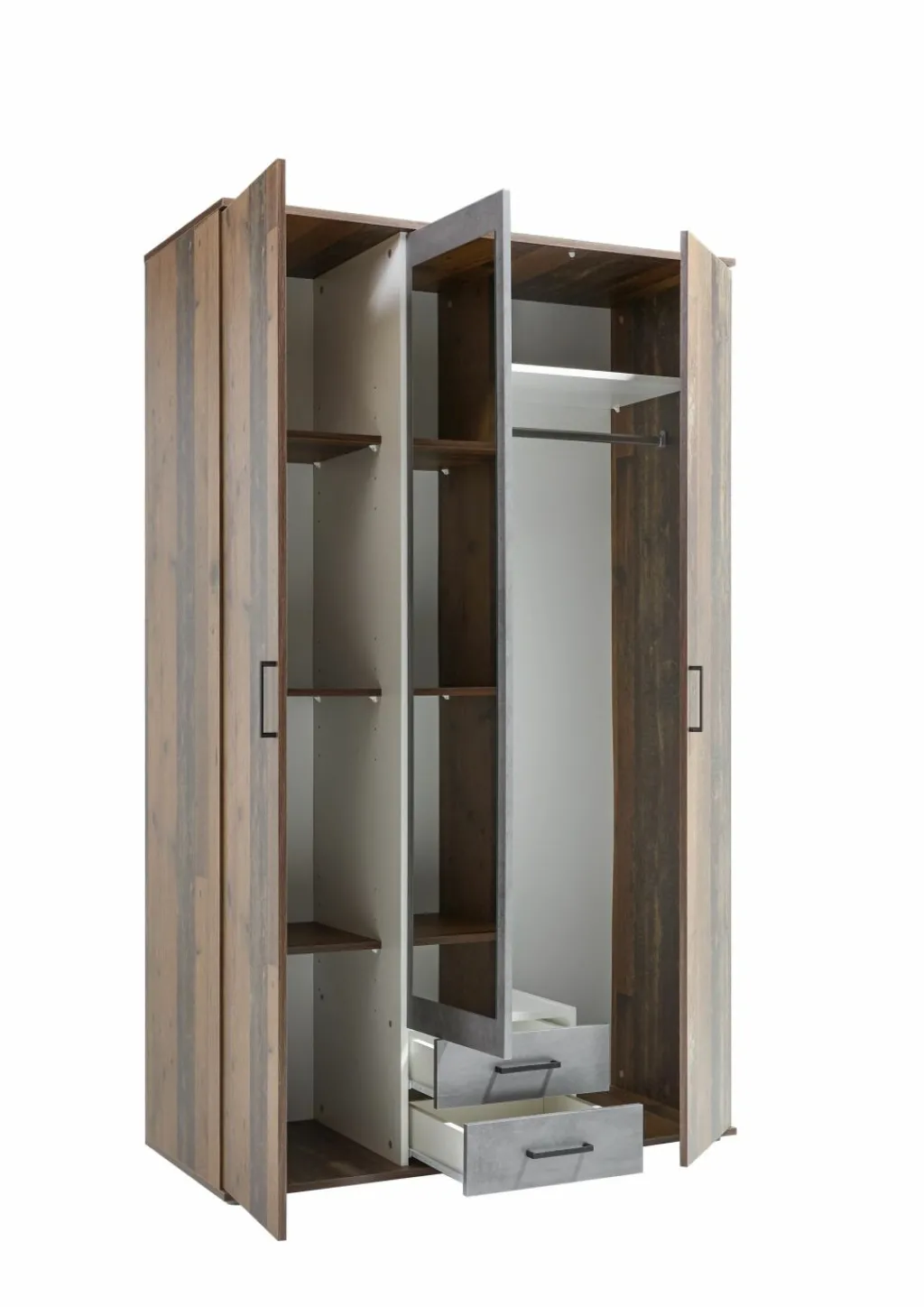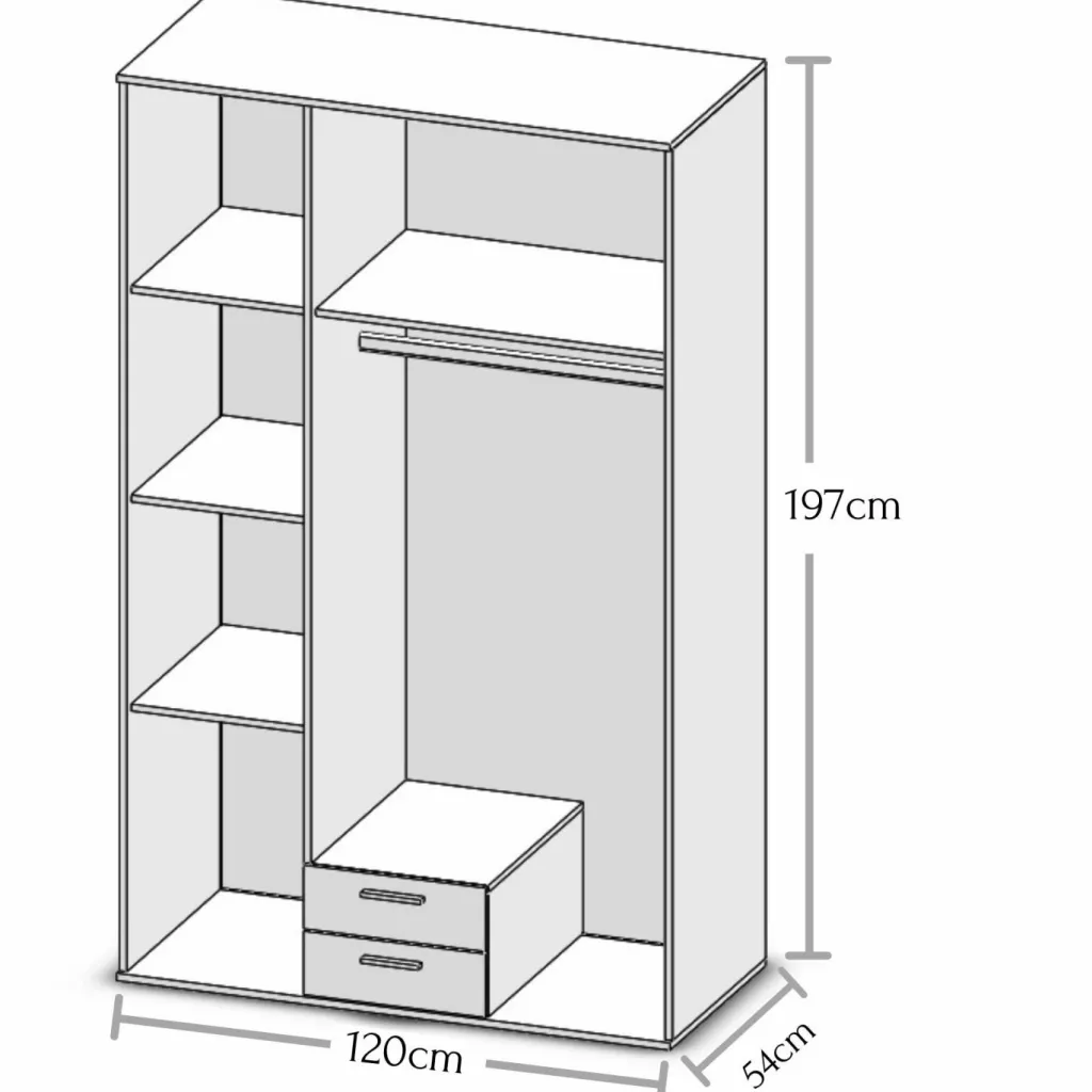 Répartition intérieure : 1 paroi médiane, à gauche 3 tablettes, à droite 1 tablette et 1 barre de penderie