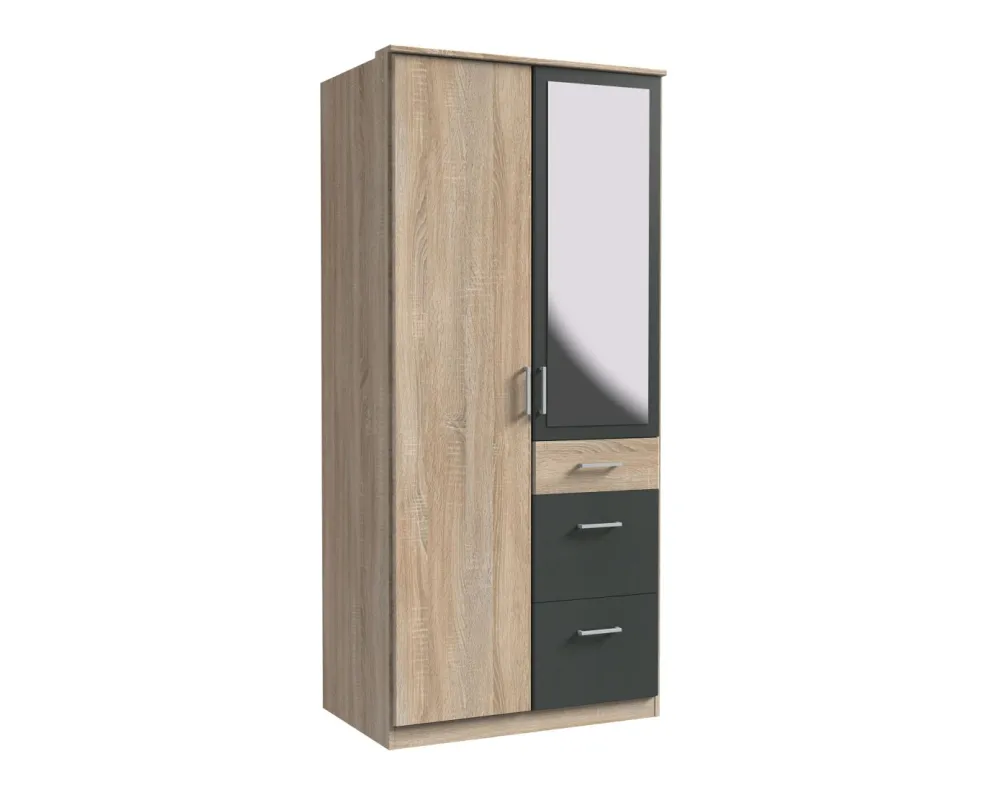 Façade et caisson : décor chêne brut de sciage et contrastes ton graphite / miroir
