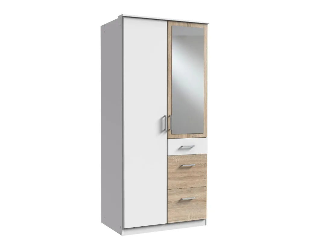 Façade et caisson : ton blanc avec contrastes décor chêne brut de sciage / miroir