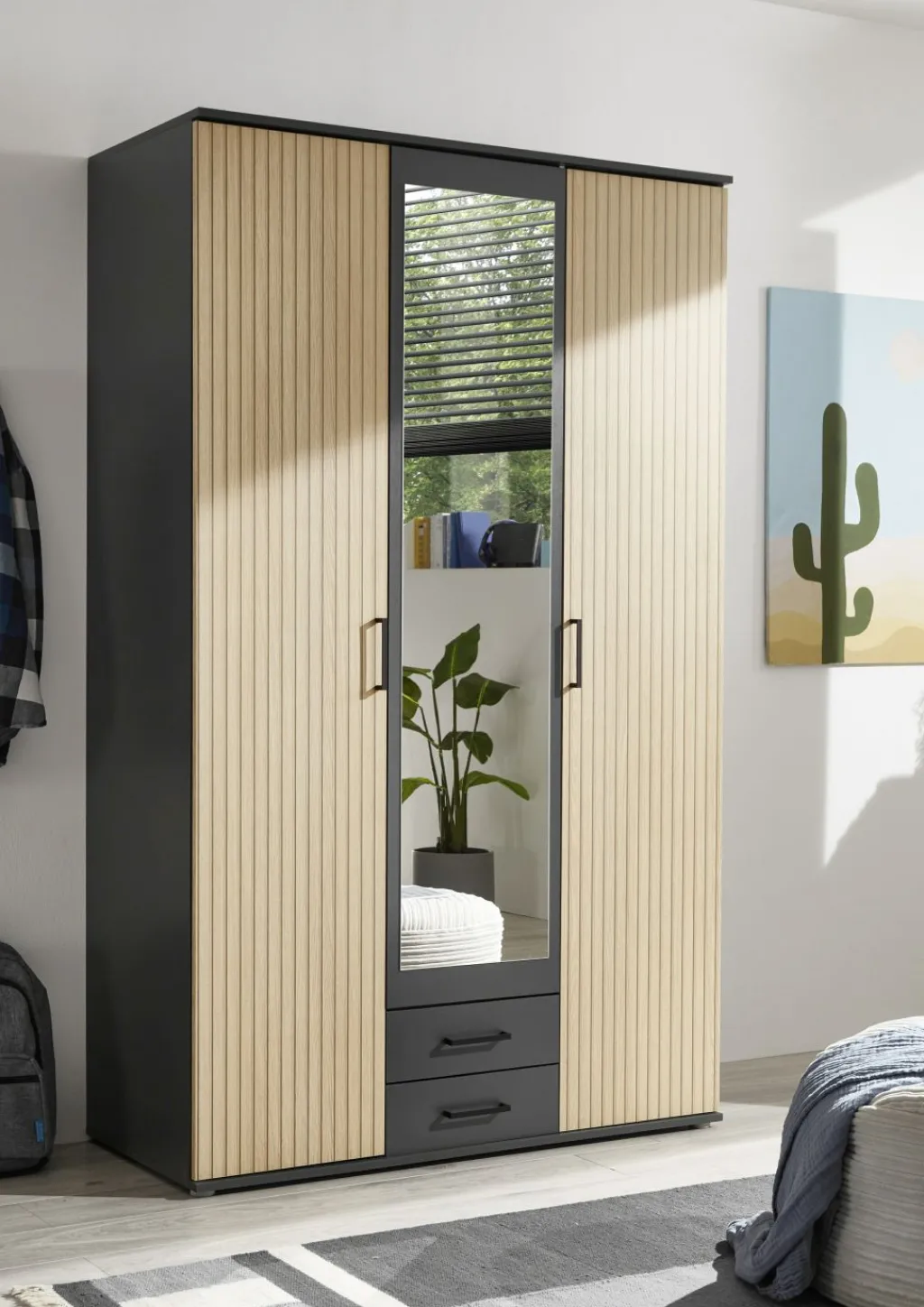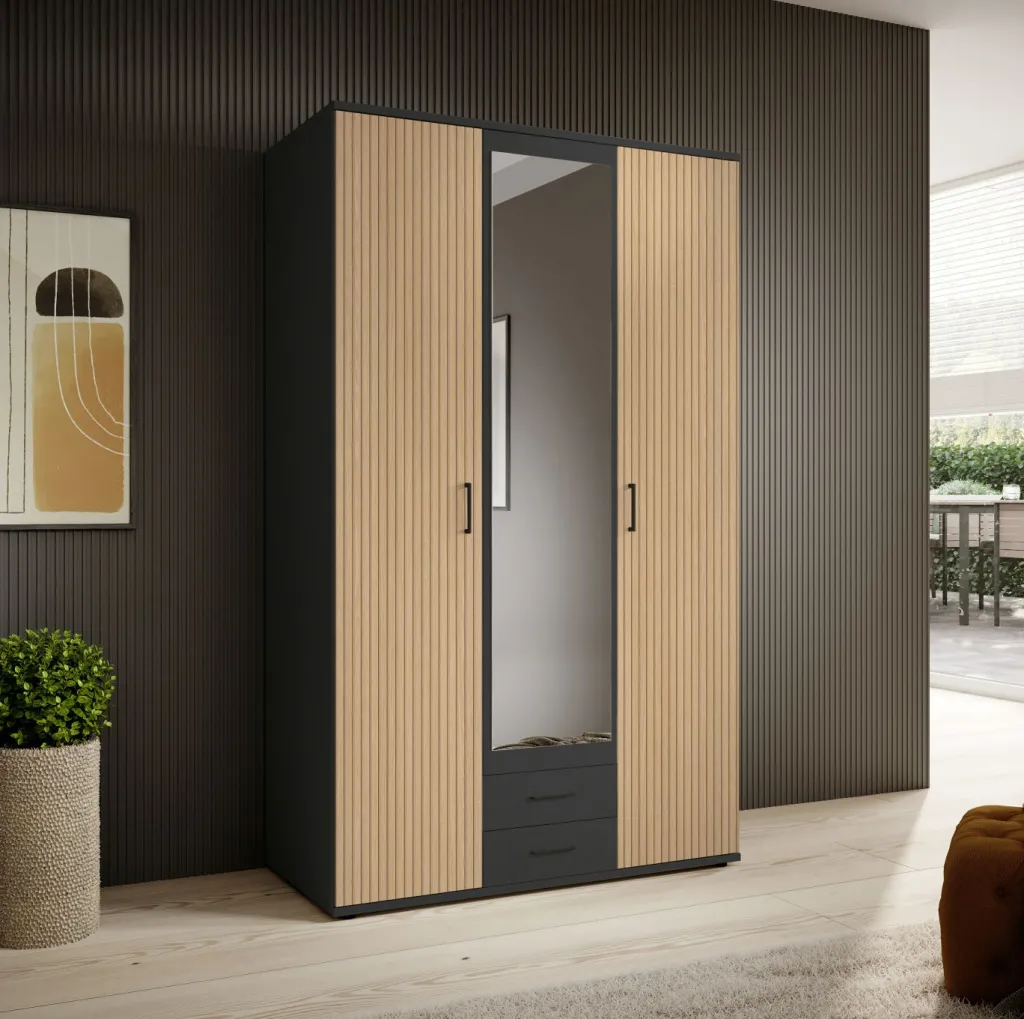 Ton graphite avec façade de porte décor lamelles de chêne, revêtement mélaminé / miroir