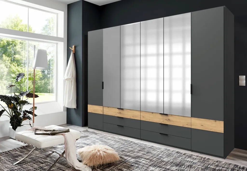 Caisson et façade : ton graphite avec contrastes décor chêne Artisan / miroir