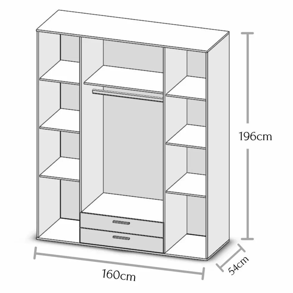 Répartition intérieure : 2 parois médianes ; à gauche et à droite, à chaque fois, 3 tablettes ; au centre : 1 tablette et 1 barre de penderie