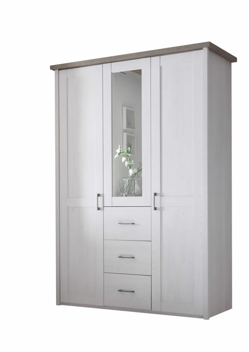 Armoire romantique dans un superbe style maison de campagne.Les façades imitation pin blanc rehaussées par un joli coloris chêne truffier confèrent à l’armoire à portes battantes LUCA un caractère ultra cosy. De plus, cette armoire à vêtements marque des points par son vaste espace de rangement et sa finition extrêmement soignée.