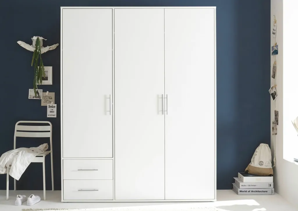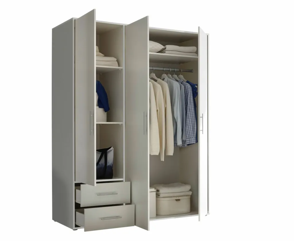 Répartition intérieure : 1 paroi médiane ; à gauche : 2 tablettes ; à droite : 1 tablette et 1 barre de penderie