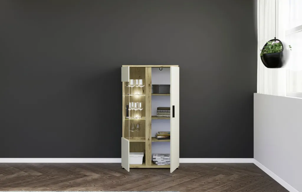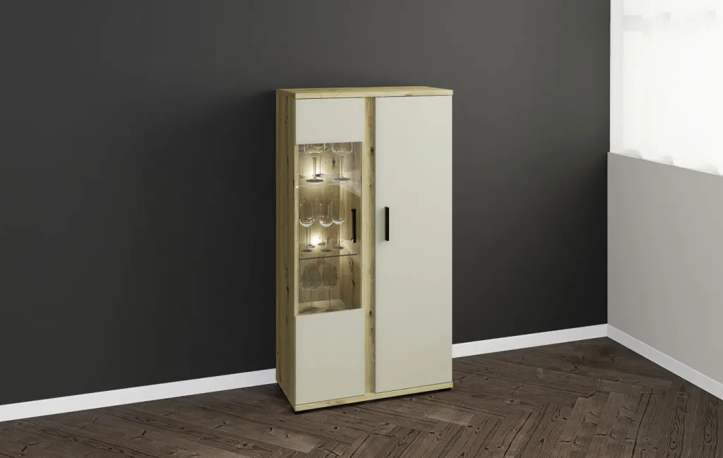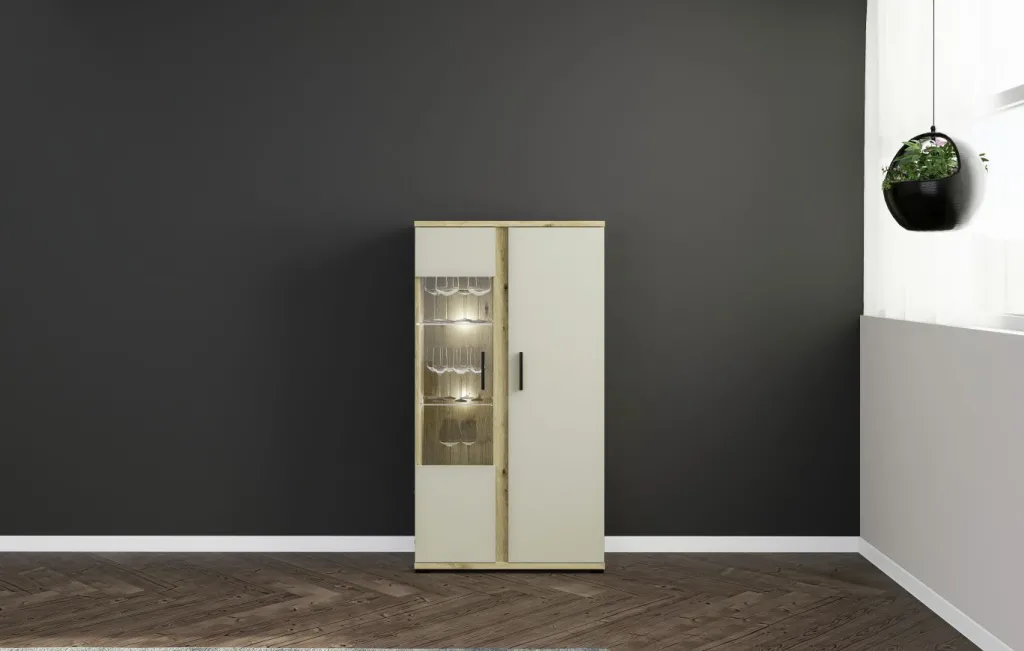 Façade : cachemire avec contrastes décor chêne Artisan, panneau de particules surfacé et mélaminé (PPSM) / verre