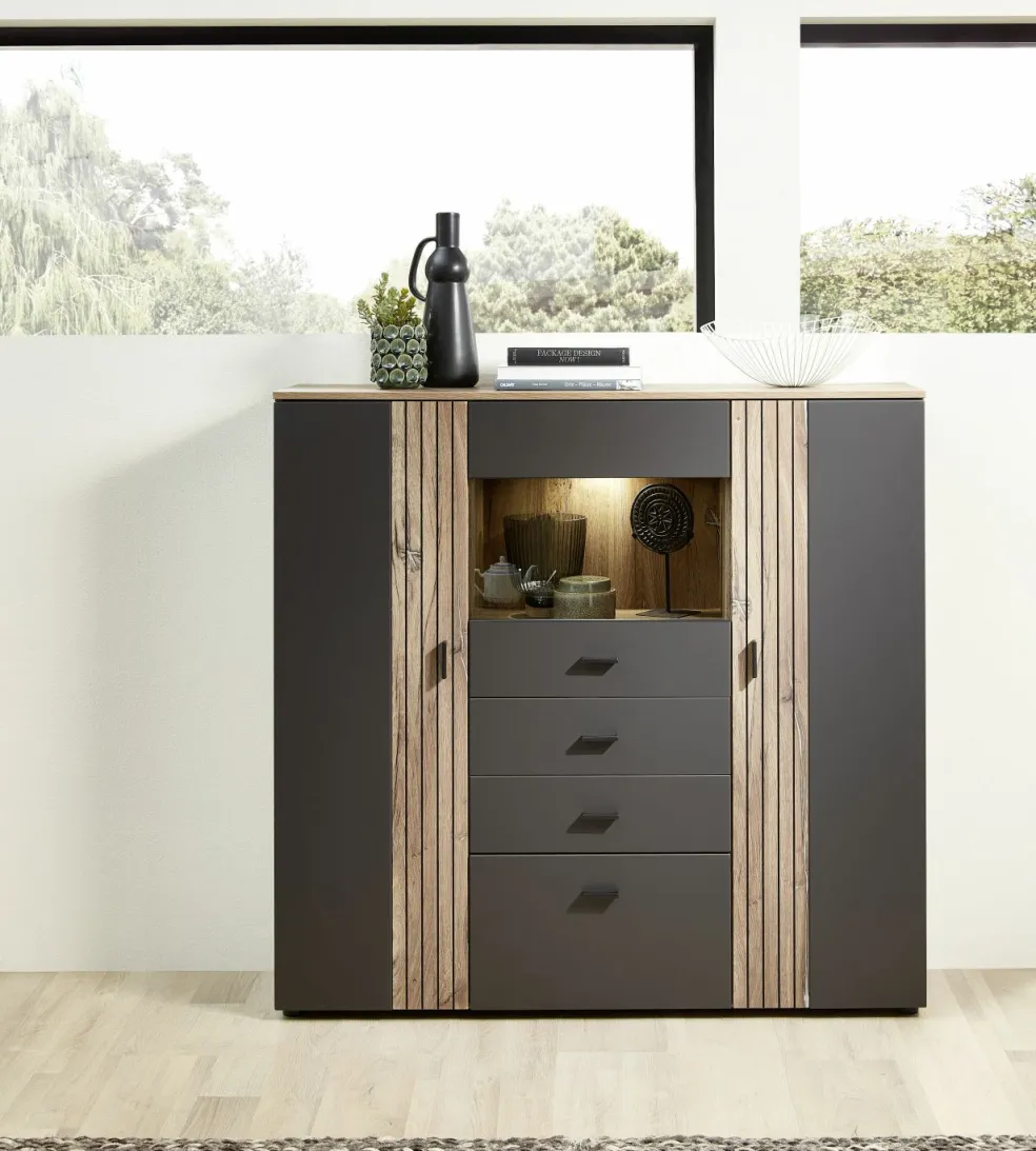 Façade : MDF (panneau de fibres de bois de densité moyenne) ton Cosmos Grey super mat avec contrastes aspect lattes en MDF décor chêne Umbra de Flagstaff / verre transparent