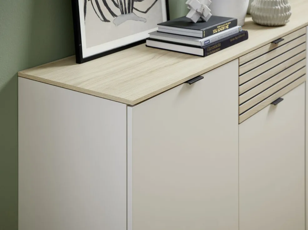 Façade : MDF (panneau de fibres de bois de densité moyenne) ton cachemire et contrastes MDF décor chêne Riva aspect lattes de bois