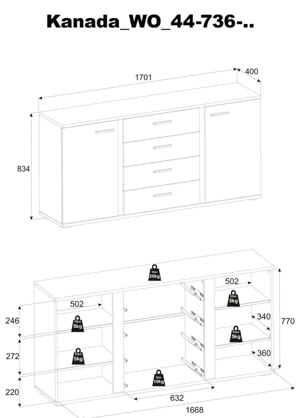 4 tiroirs avec coulisses inférieures