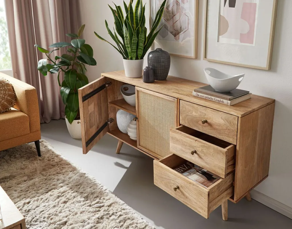 Caisson/pieds : bois de manguier massif (Inde) avec couche de vernis transparent