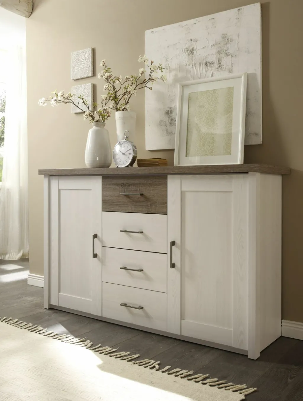 - dans un joli modèle décor pin blanc, contrastes imitation chêne truffier