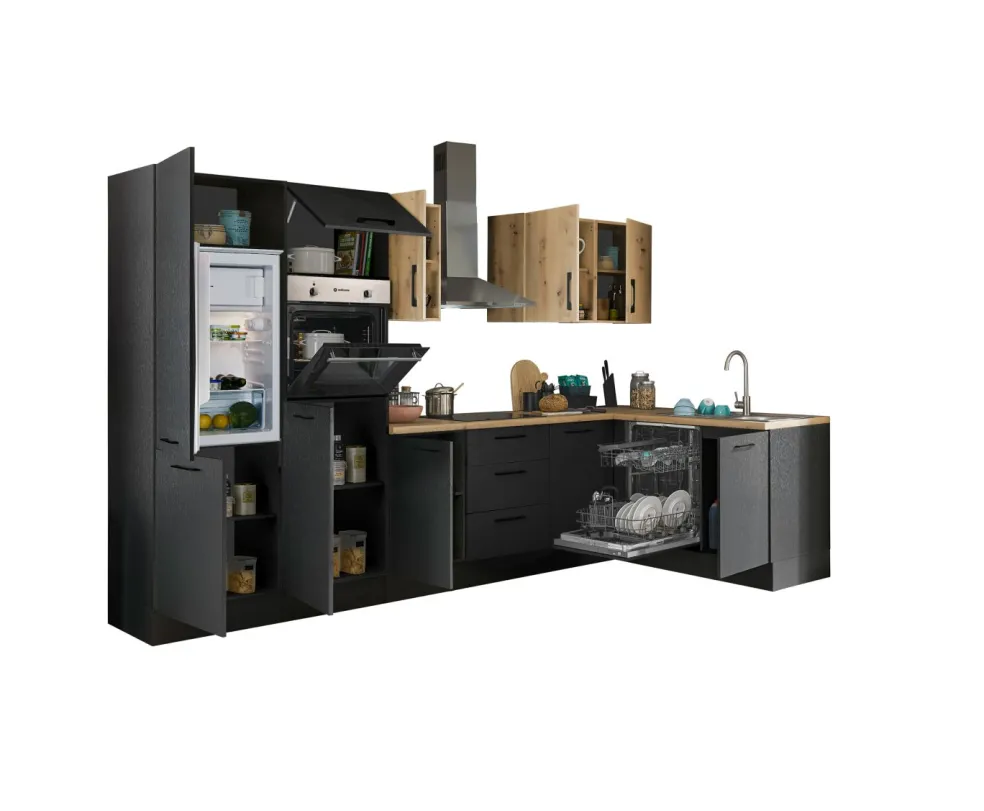 Façade et caisson : imprimé bois (woodprint) ton noir et panneau de particules surfacé mélaminé (PPSM) décor chêne Artisan