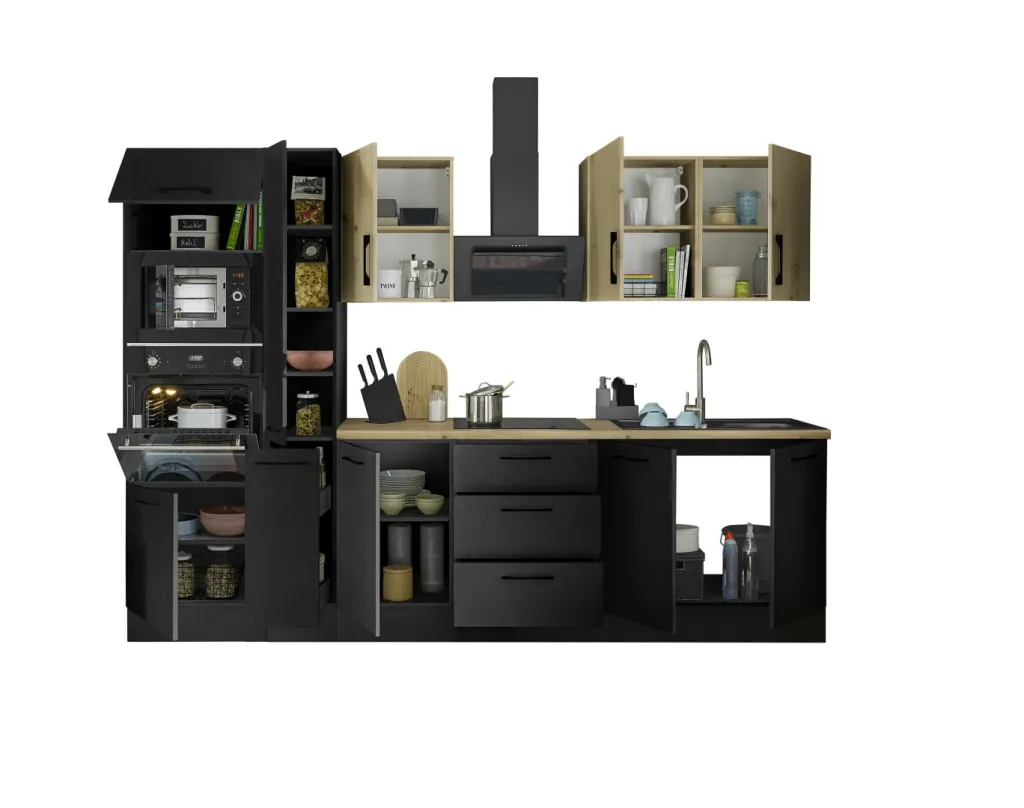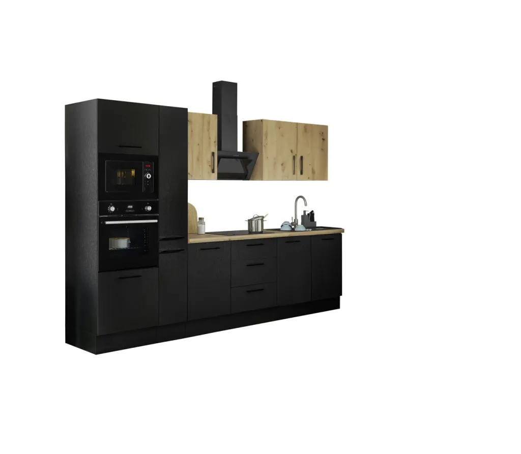 Façade et caisson : imprimé bois (woodprint) ton noir et panneau de particules surfacé mélaminé (PPSM) décor chêne Artisan