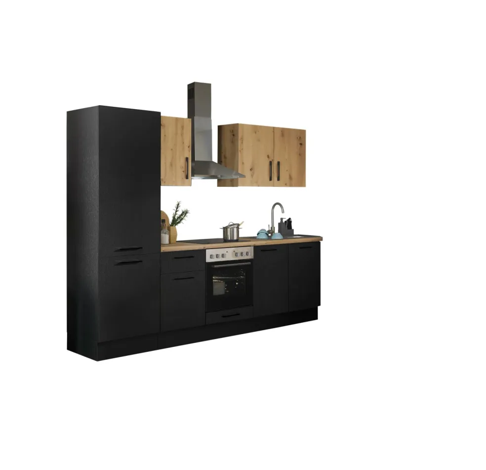 Façade et caisson : imprimé bois (woodprint) ton noir et panneau de particules surfacé mélaminé (PPSM) décor chêne Artisan