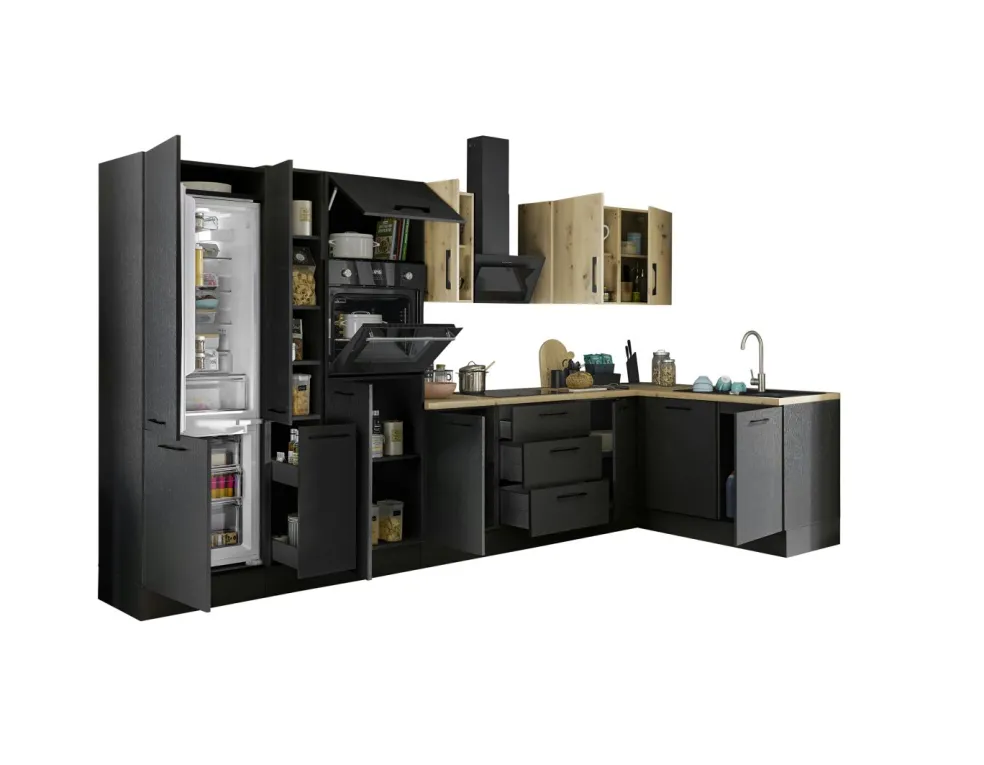 Façade et caisson : imprimé bois (woodprint) ton noir et panneau de particules surfacé mélaminé (PPSM) décor chêne Artisan