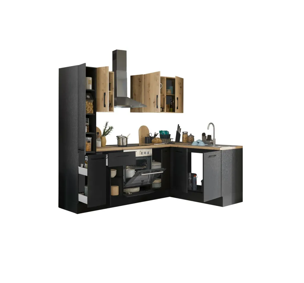 Façade et caisson : imprimé bois (woodprint) ton noir et panneau de particules surfacé mélaminé (PPSM) décor chêne Artisan