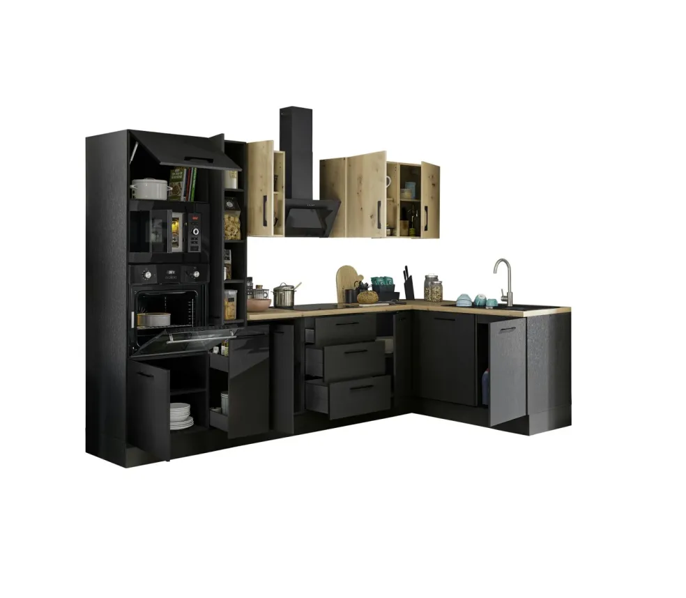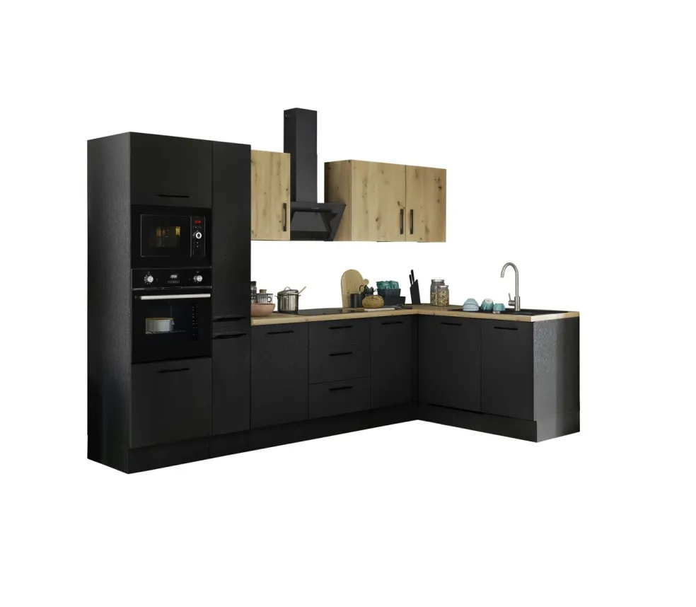 Façade et caisson : imprimé bois (woodprint) ton noir et panneau de particules surfacé mélaminé (PPSM) décor chêne Artisan