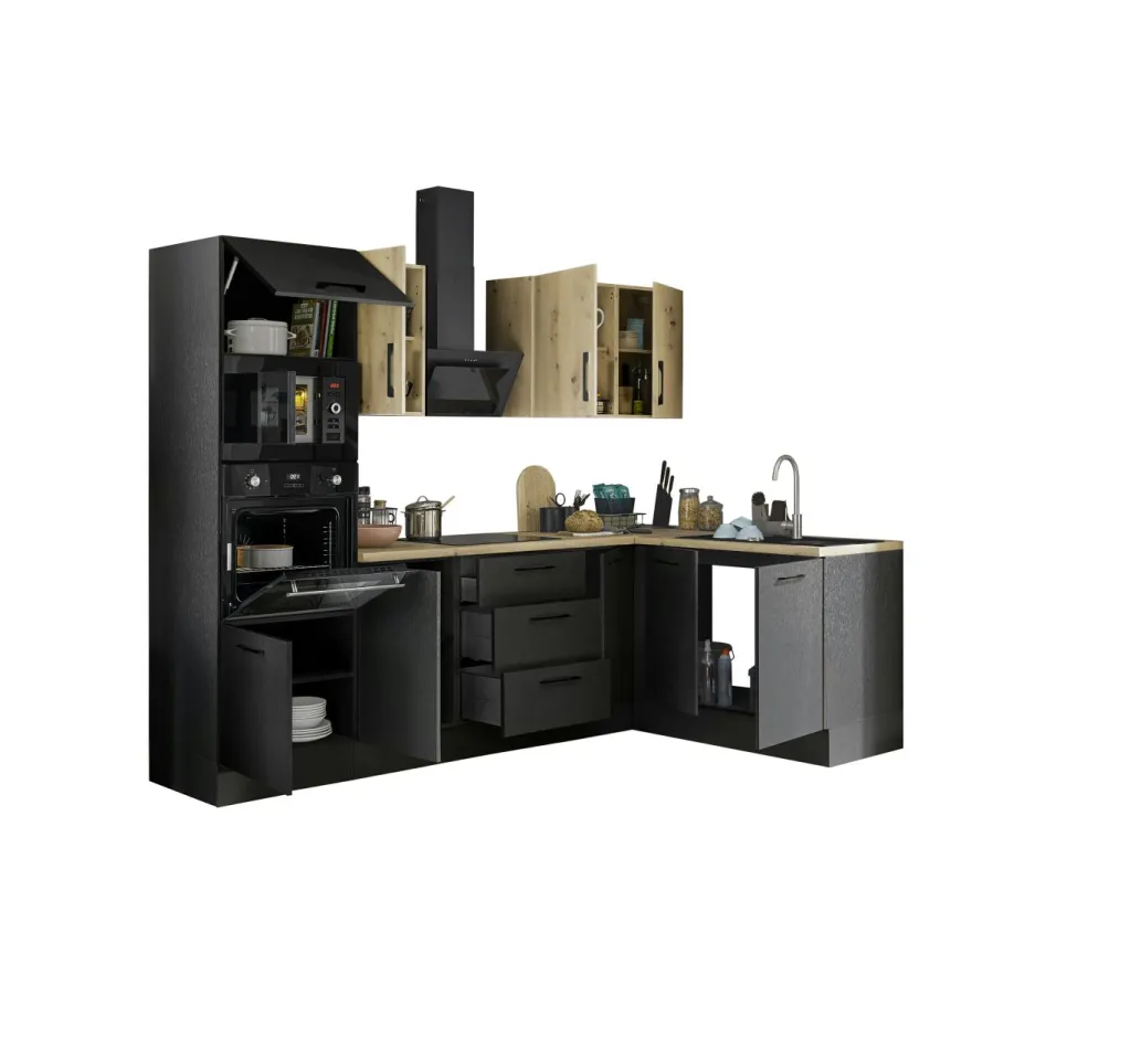 Façade et caisson : imprimé bois (woodprint) ton noir et panneau de particules surfacé mélaminé (PPSM) décor chêne Artisan