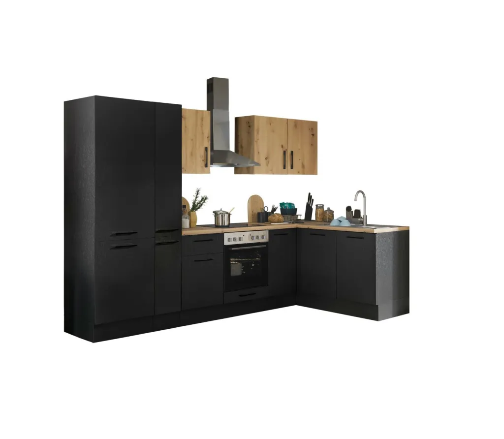 Façade et caisson : imprimé bois (woodprint) ton noir et panneau de particules surfacé mélaminé (PPSM) décor chêne Artisan