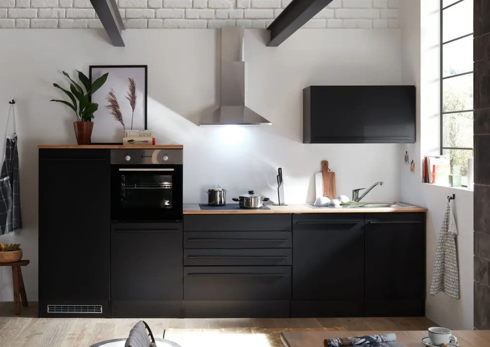 Poignées : matière synthétique ton noir mat (poignée barre)
