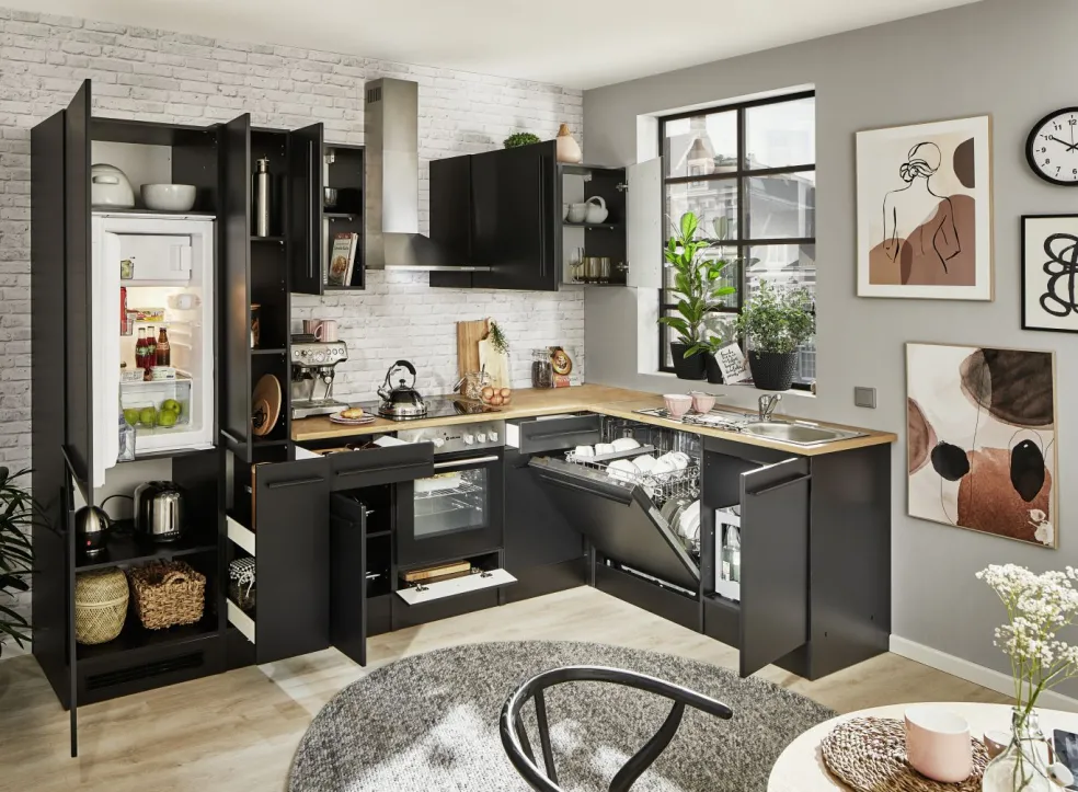 Poignées : matière synthétique ton noir mat (poignée barre)