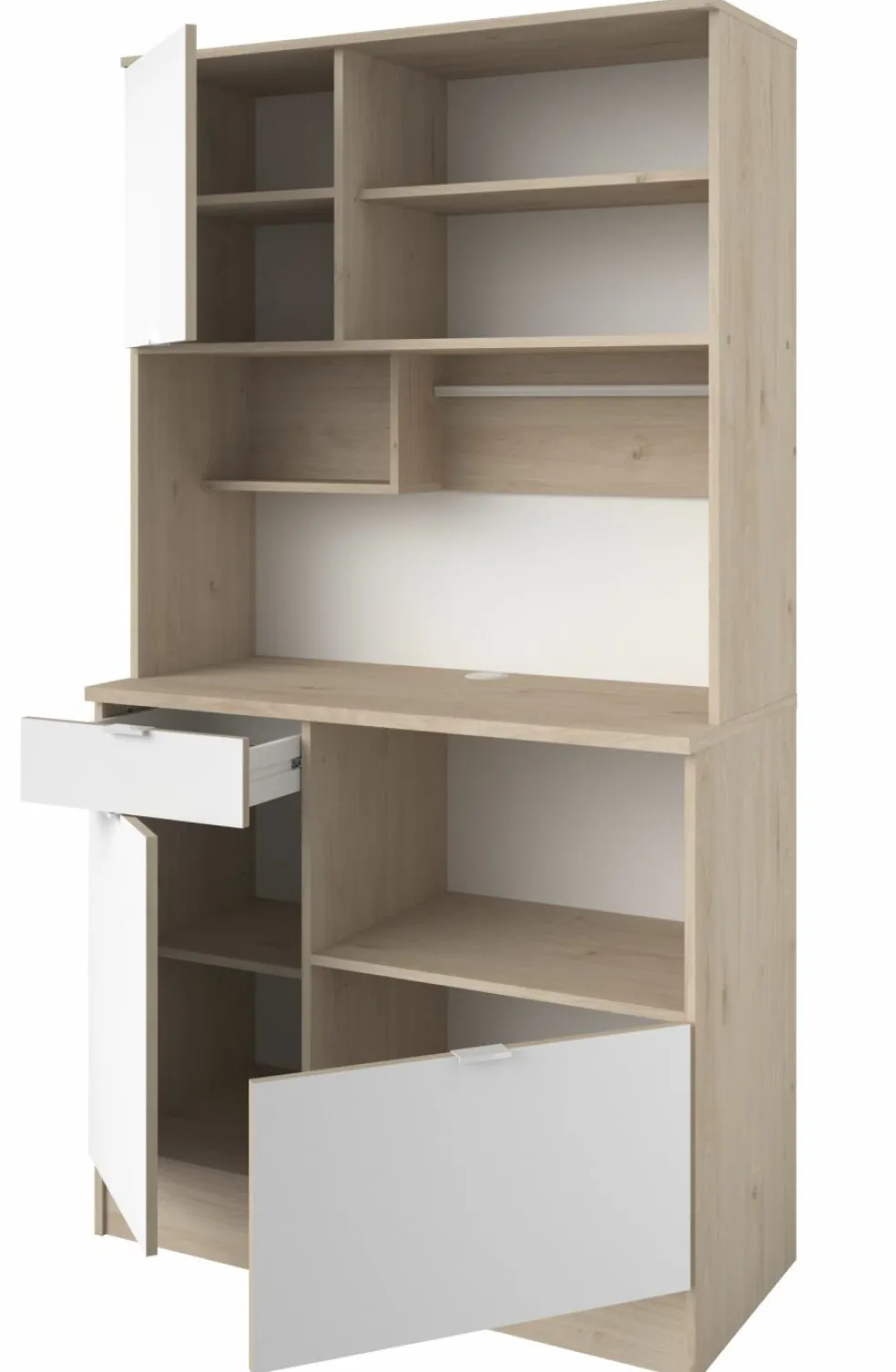 au centre : 1 petit casier, 1 barre métallique pour les dfférents ustensiles et un passe-câbles dans le panneau supérieur