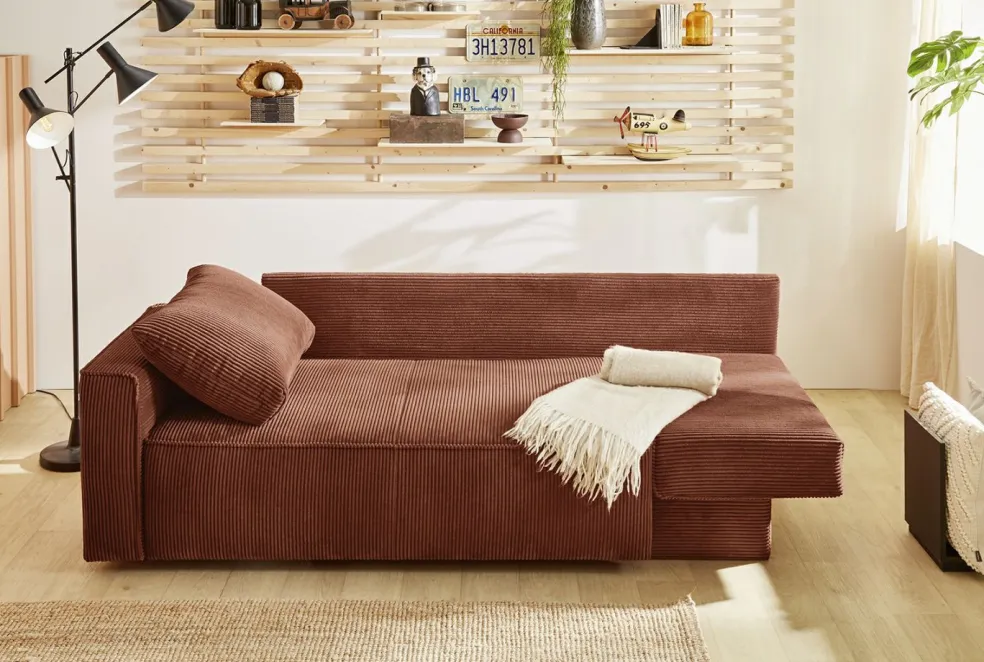 Le canapé se transforme facilement en lit en coulissant l’assise latéralement à l’aide de la dragonne et en basculant l’accoudoir.