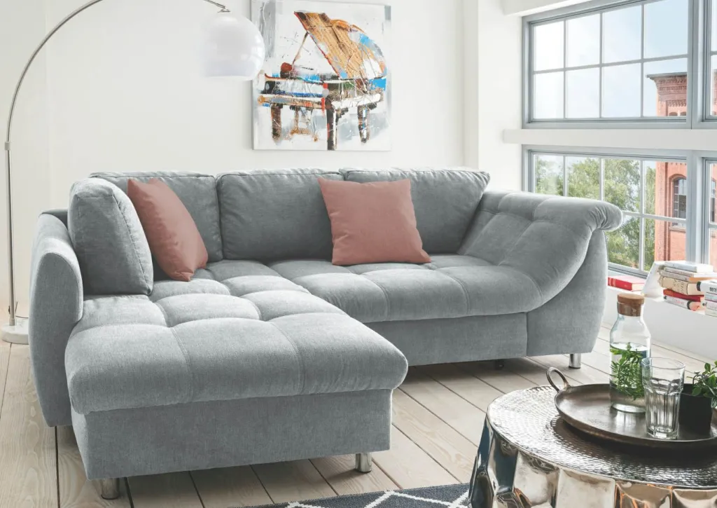 Revêtement : canapé d’angle en tissu Tonia ton gris 95% polyester et 5% nylon ; coussins décoratifs en tissu Mango ton flamingo 100% polyester