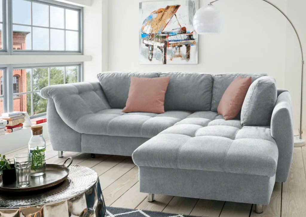 Revêtement : canapé d’angle tissu Tonia ton gris 95% polyester et 5% nylon; coussins décoratifs tissu mango ton flamingo 100% polyester