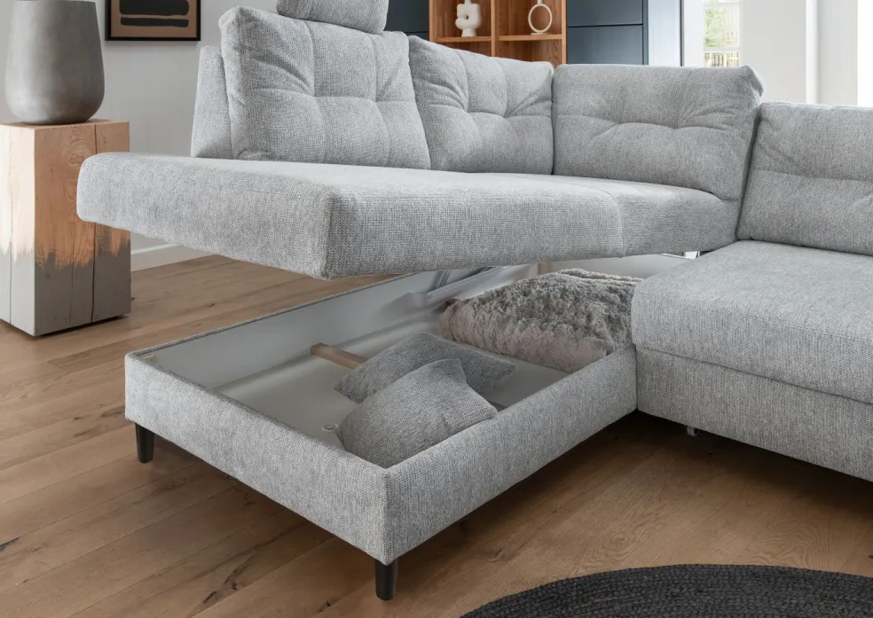 | Equipement canapés: | Appuie-tête(s), Dos habillé, Méridienne à gauche, incl. coffre de lit, incl. coussins | ||