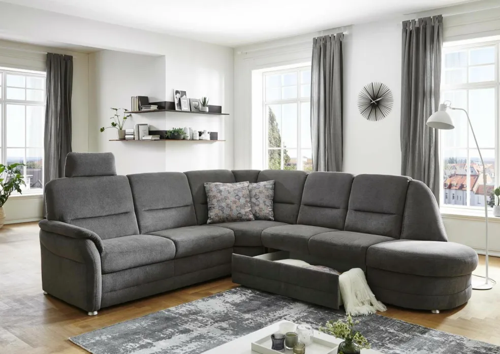 | Equipement canapés: | Appuie-tête(s), Dos habillé, Méridienne à droite, incl. coffre de lit | ||