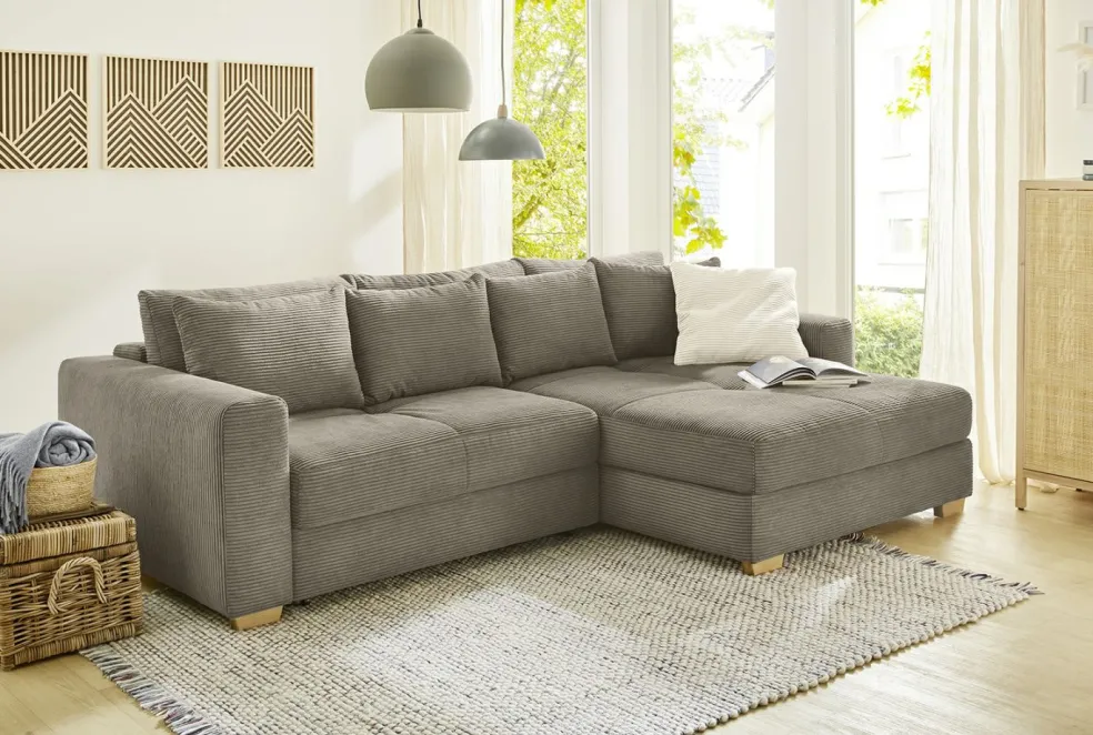 Revêtement : corps, assise, coussins de dos et coussins de taille moyenne en velours côtelé 426/18 ton taupe 100% polyester ; coussin mou en velours côtelé 426/07 ton beige 100% polyester
