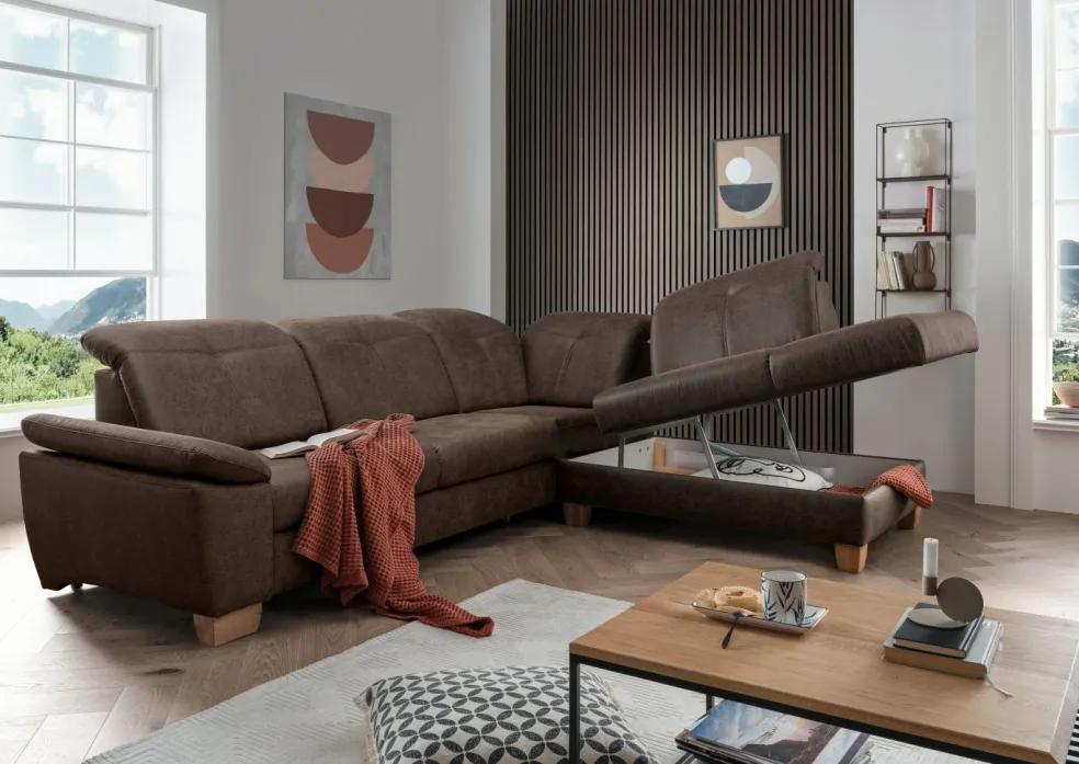 | Equipement canapés: | Appuie-tête(s), Dos habillé, Méridienne à droite, incl. coffre de lit | ||