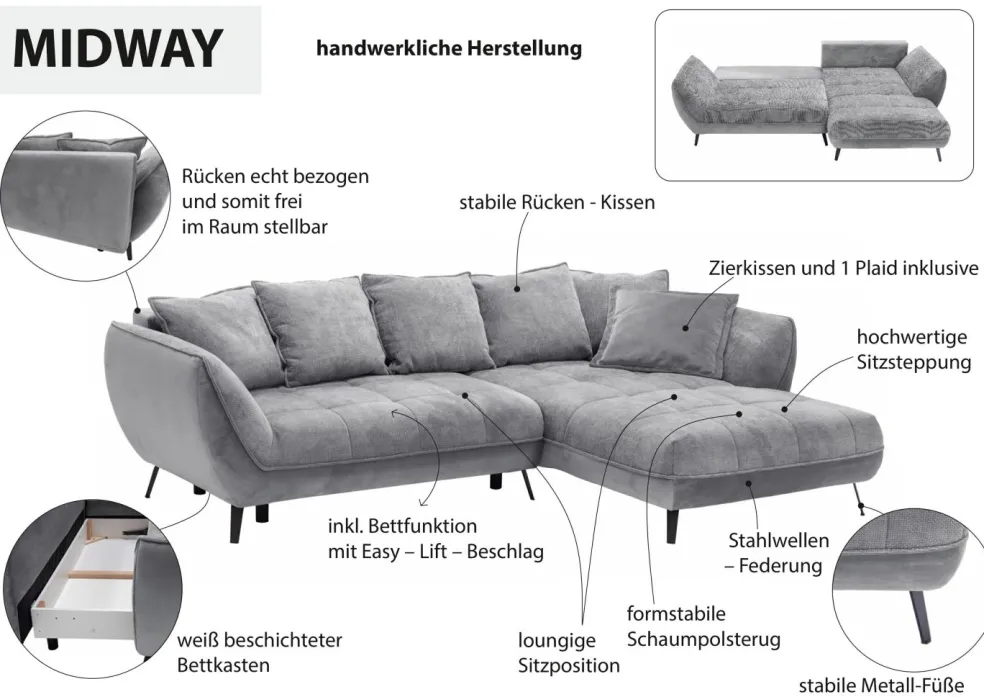 | Equipement canapés: | Dos habillé, Espace de rangement, Méridienne à droite, incl. coussins | ||