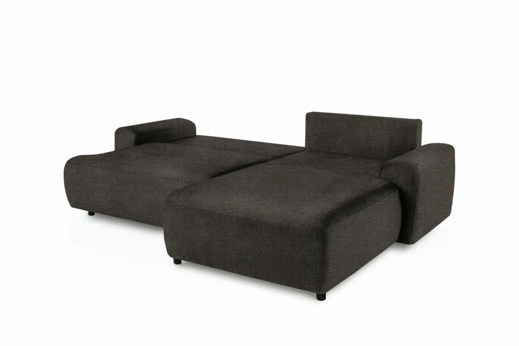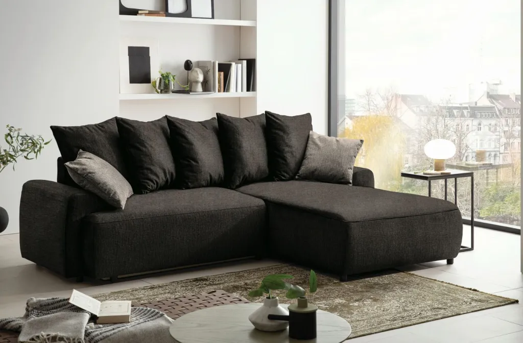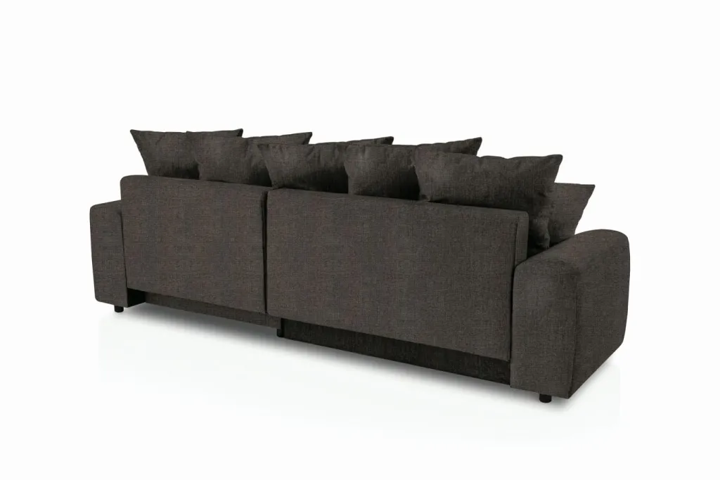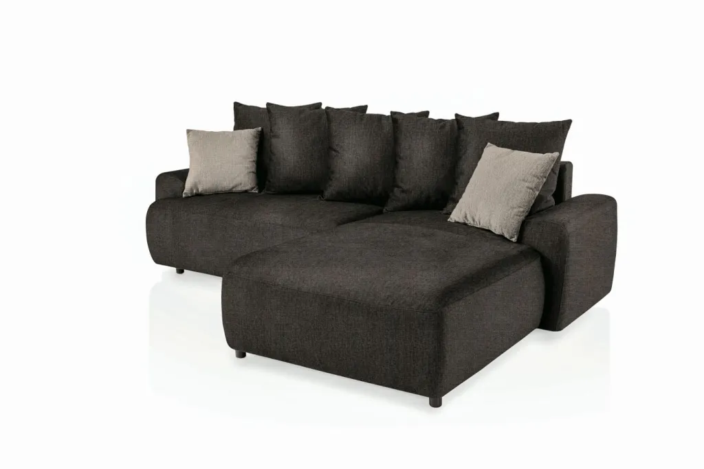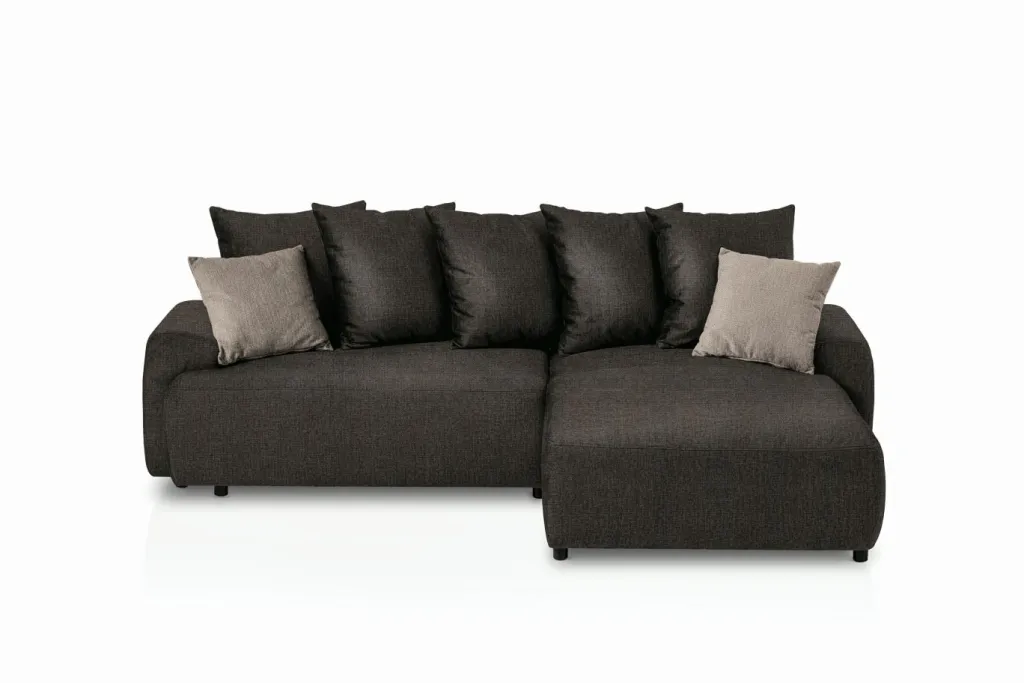 Revêtement : canapé d’angle en tissu Aragon 97 ton marron 100% polyester ; coussins décoratifs en tissu Aragon 20 ton taupe 100% polyester