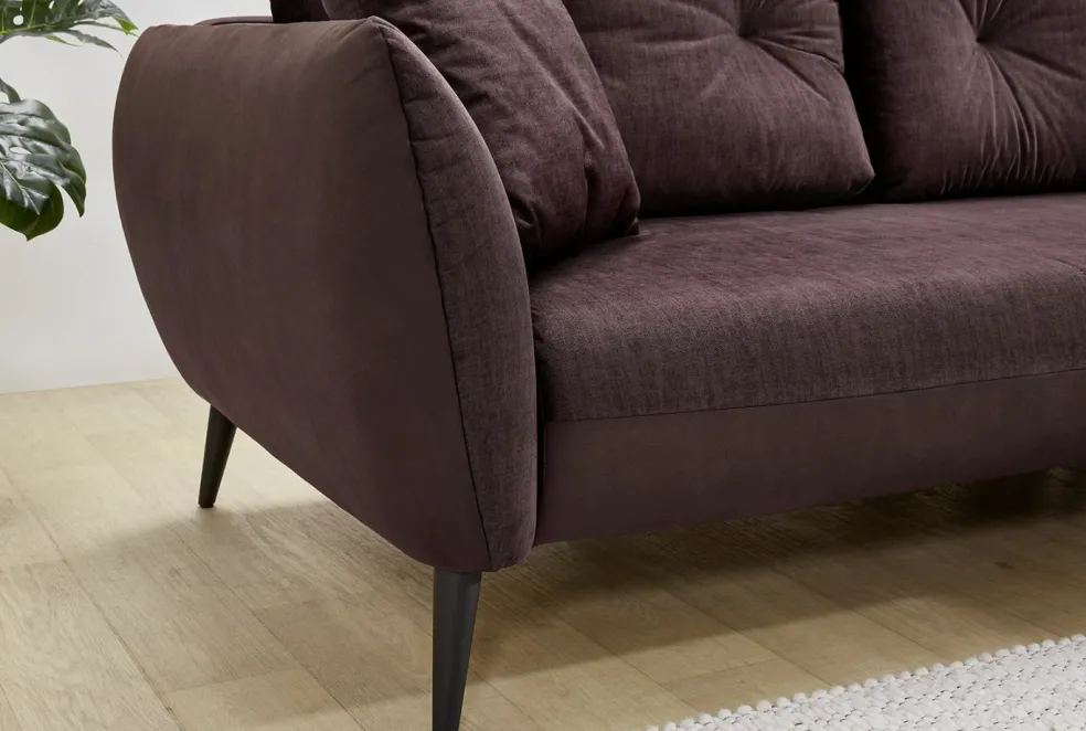 Revêtement : corps dans un tissu ton aubergine 100% polyester ; assise, grands coussins et coussins de dos dans un tissu aspect velours ton aubergine 100% polyester ; coussins décoratifs dans un tissu microfibre à motif floral 100% polyester