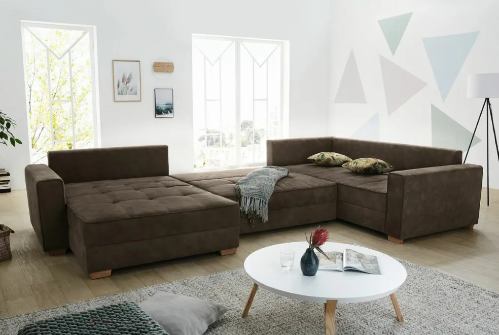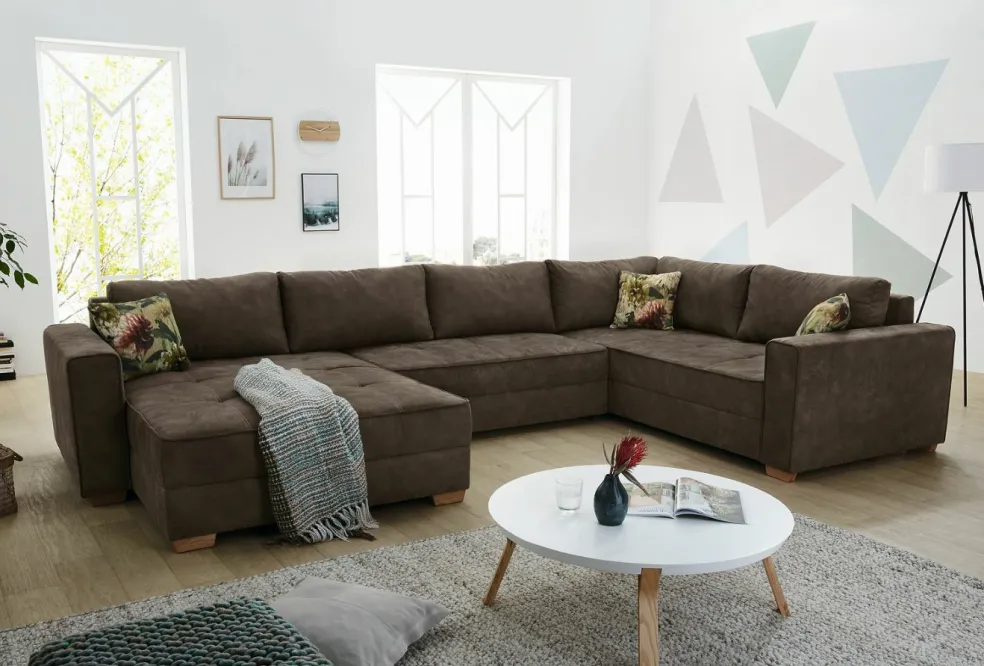 Revêtement : canapé en U tissu microfibre ton marron 100 % polyester ; coussins décoratifs en tissu 100 % coton imprimé avec motif floral