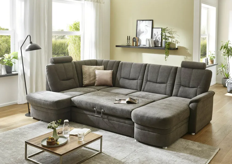 | Equipement canapés: | Dos habillé, Méridienne à droite, incl. coffre de lit | ||