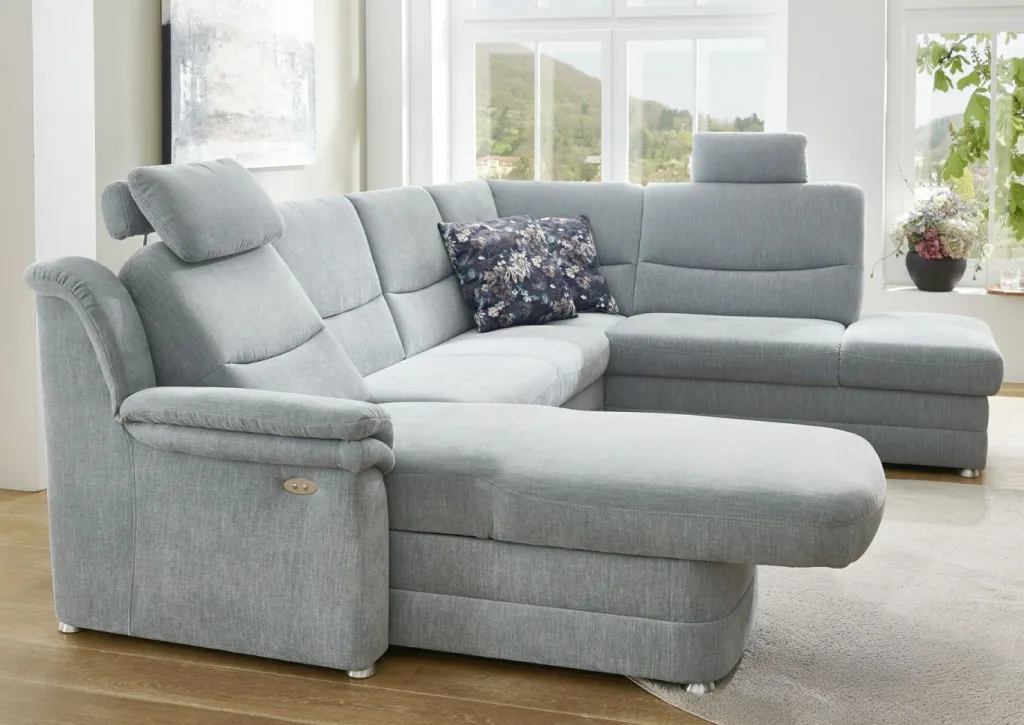 1 méridienne avec fonction électrique et accoudoir à gauche; fonction relax réglable en appuyant sur un bouton ; profondeur réglable jusqu’à la position allongée, env. 199 cm