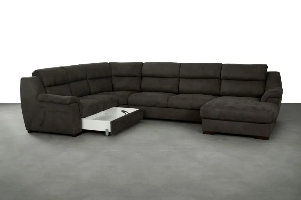 | Equipement canapés: | Dos habillé, Méridienne à droite, incl. coffre de lit | ||