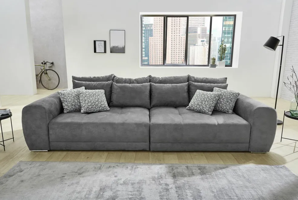 Revêtement : corps, assise, grands coussins et coussins de taille moyenne en tissu microfibre ton gris foncé 100 % polyester ; petits coussins dans un tissu Jacquard à motifs ton gris clair 43 % polyester, 43 % polyacrylique et 14 % coton