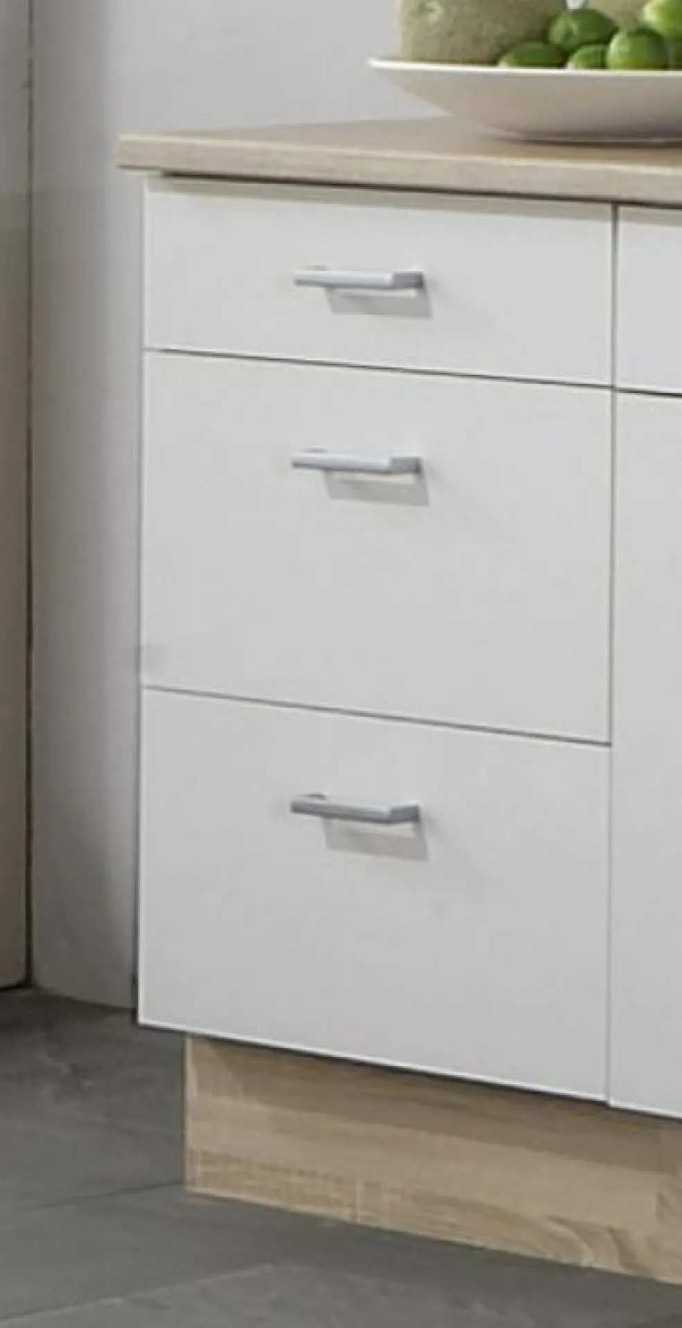 Issu de la jolie cuisine SONEA, voici : un casserolier dans un joli coloris : blanc/imitation chêne Sonoma avec trois tiroirs.