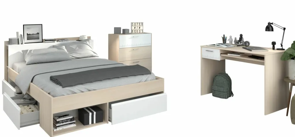 1 tête de lit avec tablette et, de chaque côté, 2 casiers