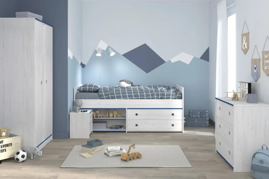 Cette chambre d’ado 4 éléments est proposée dans un coloris clair et créera une ambiance conviviale pour se sentir bien. Les chants ton rose ou bleu lui confèrent un aspect tendance. Le lit confortable avec ses grands tiroirs offre beaucoup de place pour les jouets, les livres et bien plus encore. Un chevet à côté du lit avec un tiroir très pratique permet de faire régner l’ordre. Dans l’armoire à portes battantes, on peut ranger vêtements et accessoires de façon ordonnée. La commode comprise dans l’ensemble, avec ses 3 tiroirs ultra pratiques, offre un espace de rangement supplémentaire.