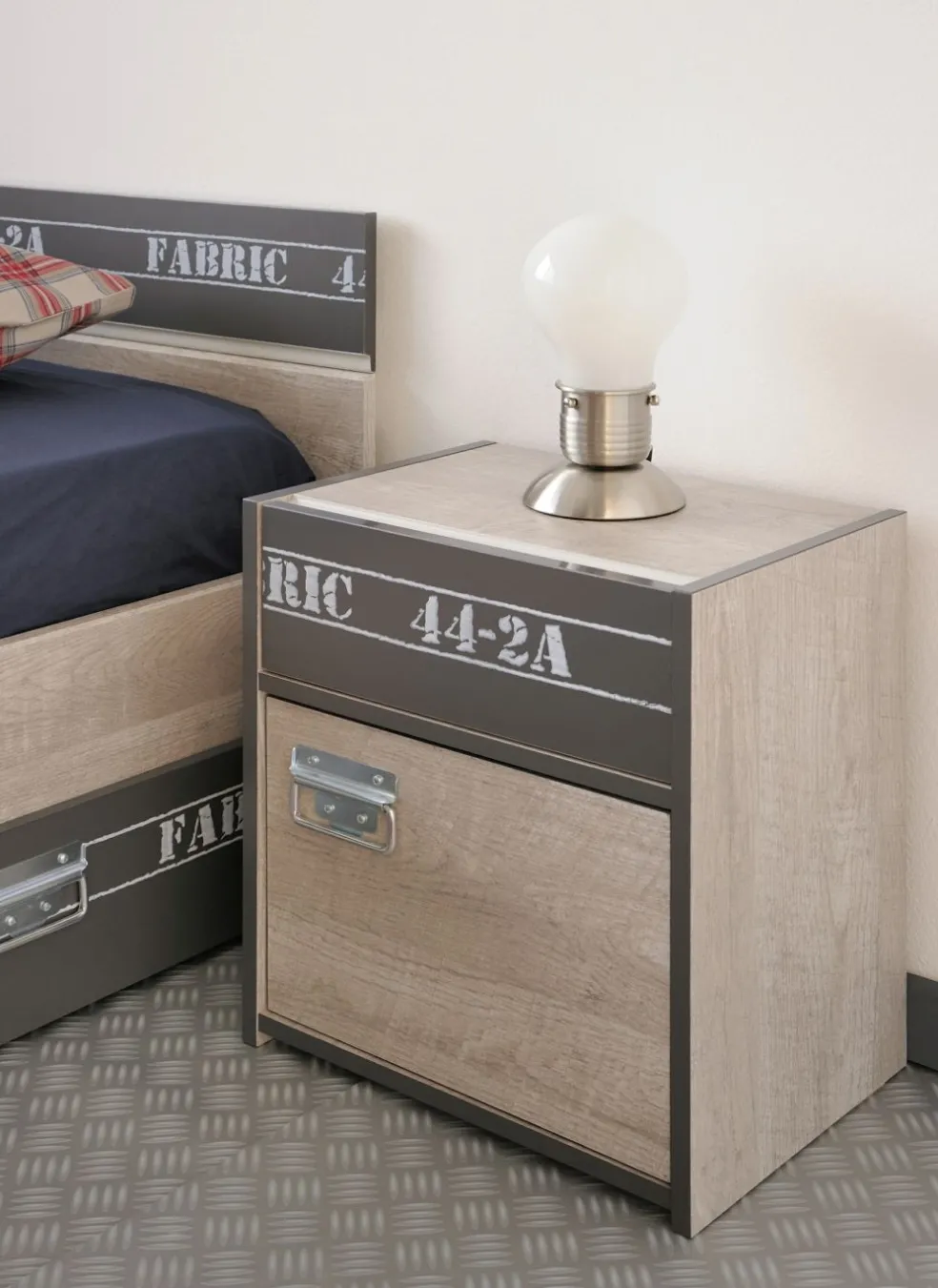 Voici un chevet cool et tendance dans un style industriel avec des possibilités de rangement pratiques dans un tiroir et derrière une porte. Le motif imprimé attirera tous les regards.