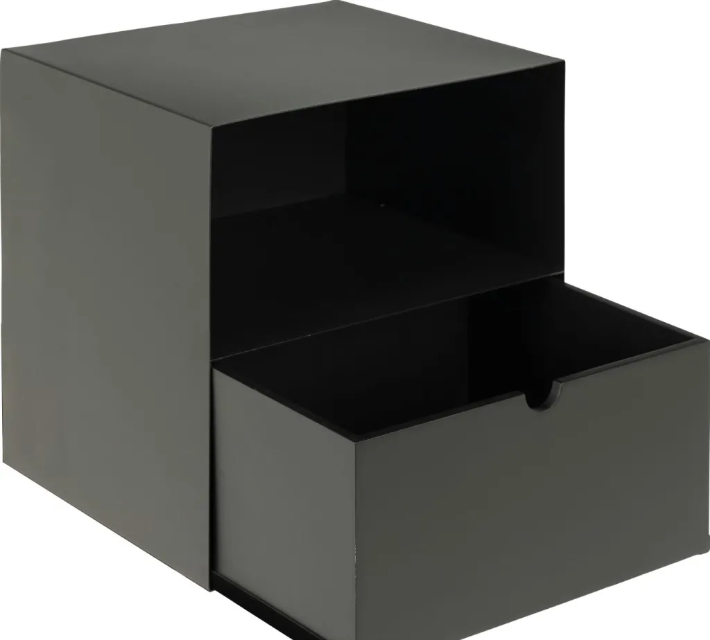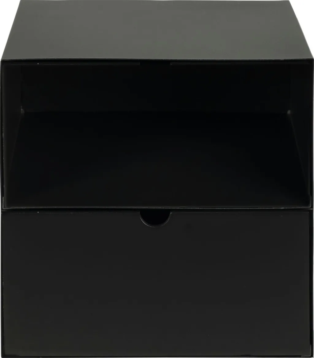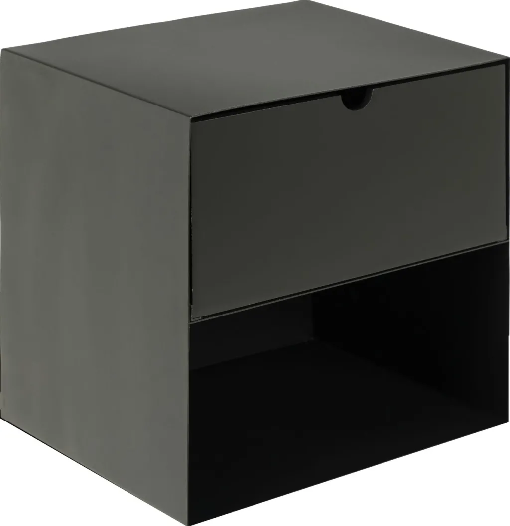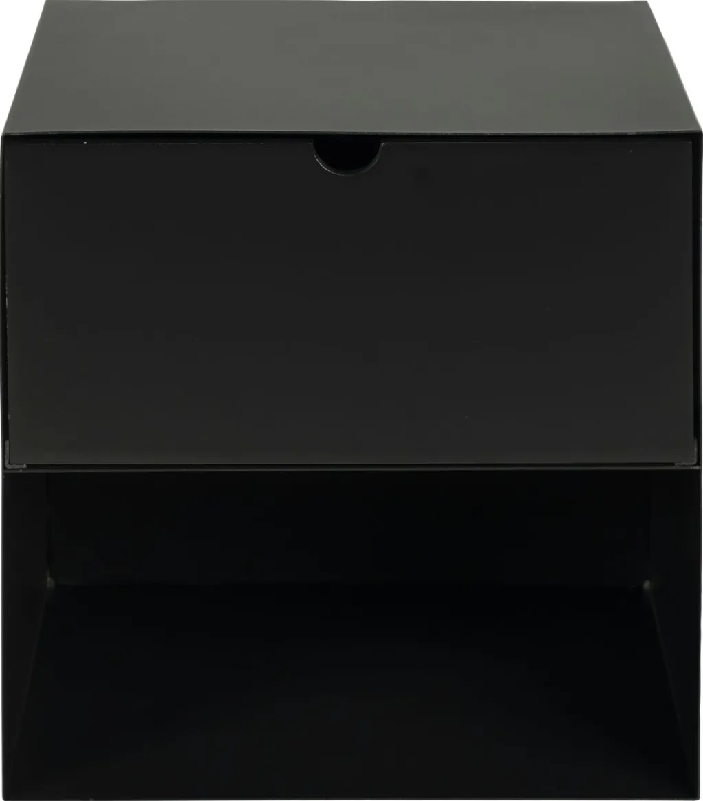 Caisson et façade : métal finition époxy aspect rugueux ton noir mat et un tiroir en MDF (panneau de fibres de bois de densité moyenne) ton noir