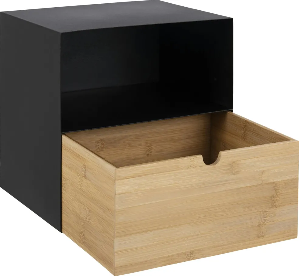 Caisson et façade : métal finition époxy aspect rugueux ton noir mat et un tiroir en bambou massif (Chine) avec couche de laque NC
